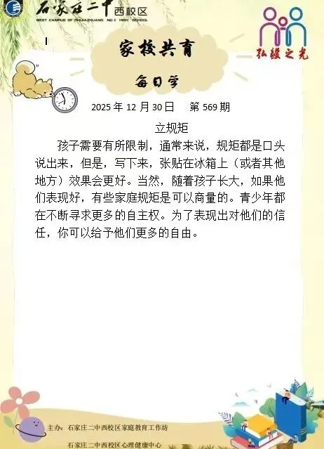 “家校共育每日学”栏目坚持每日推送,2025年度累计推送204期(第365至569期)。内容聚焦青春期教育、学习习惯培养、亲子沟通等家长关切的主题,以简洁直观的海报形式,提供即学即用的教育指南。