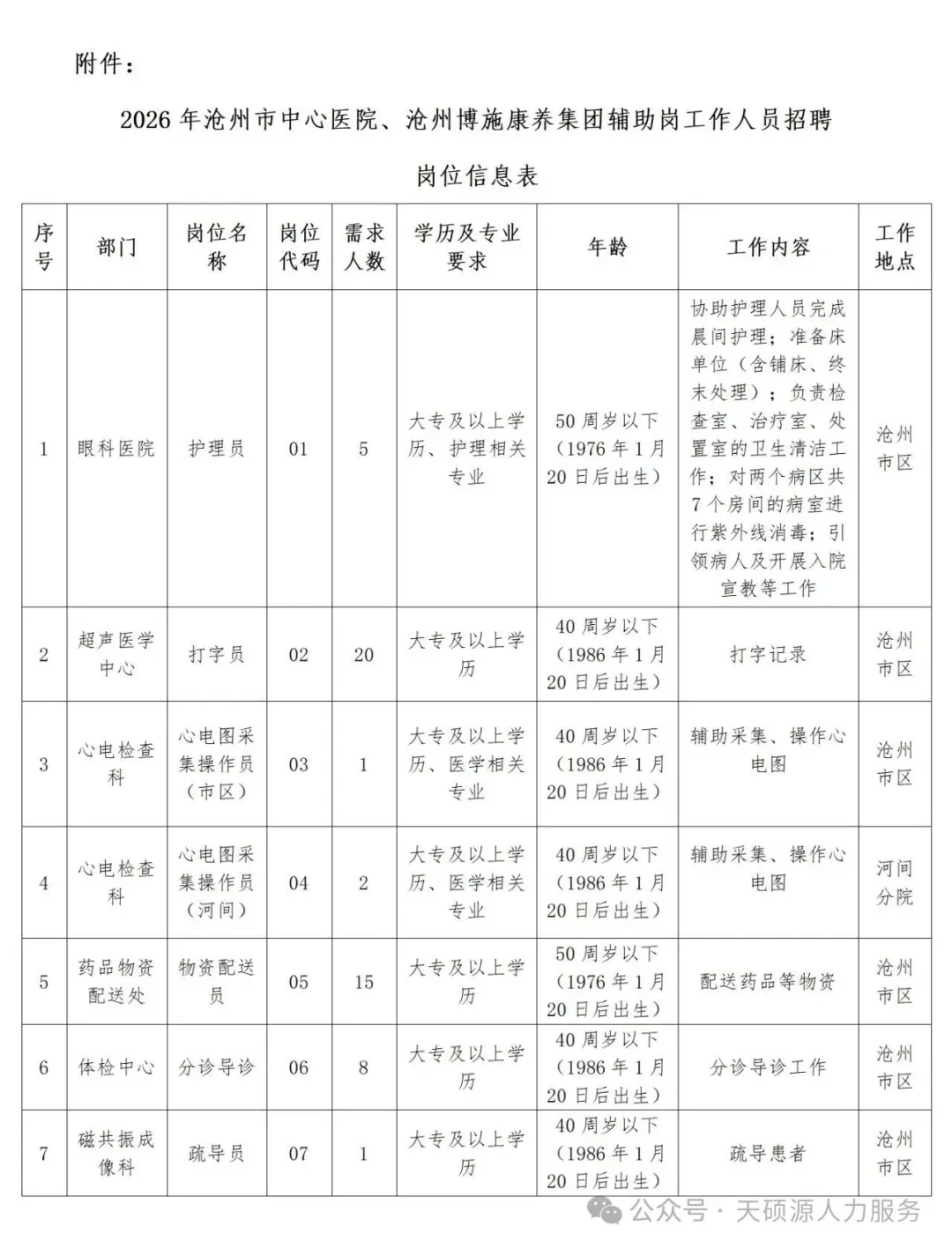 具体岗位、招聘条件等信息详见《2026年沧州市中心医院、沧州博施康养集团辅助岗工作人员招聘岗位信息表》(附件)。