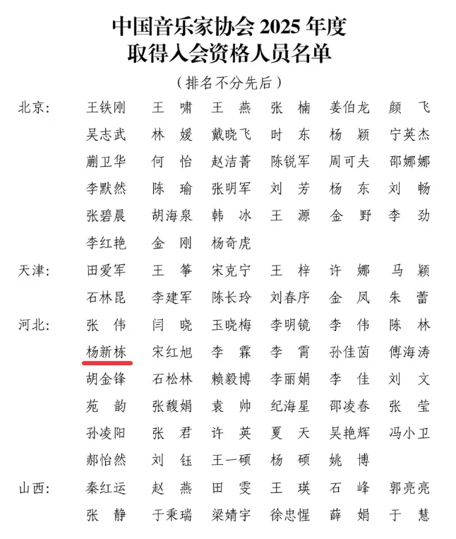 中国音乐家协会日前公布了2025年度取得入会资格名单。三中教育集团一附小教师杨新栋经多轮审核,正式成为中国音乐家协会会员。