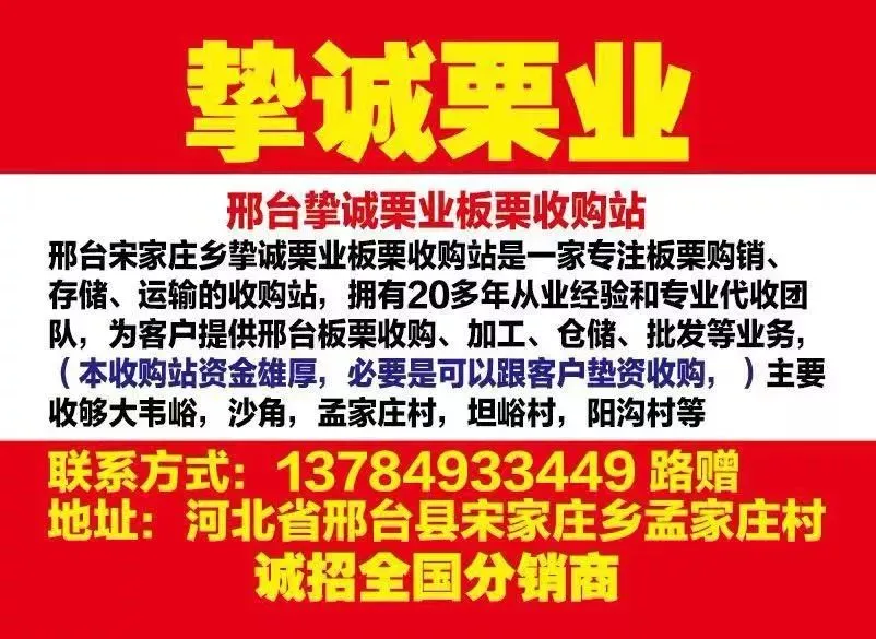 1、代收、代储、代加工邢台3113板栗、邢台老树板栗。一、邢台市挚诚栗业板栗专业合作社已有十多年的板栗经营历史,集板栗收购、加工、批发、零售为一体,立足邢台3113主产区,收购产品直接来自农户。最领先的全自动振动筛,电脑调速,五道传送带,六个等级,均匀度可靠,品质有保证。