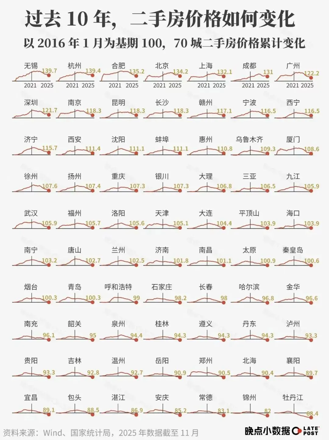 以2016年1月为基期100,至2025年11月,全国70城二手房价格累计变化显示:26个城市的房价已经跌回了十年前,还有44个城市的房价没有跌回2016年。
