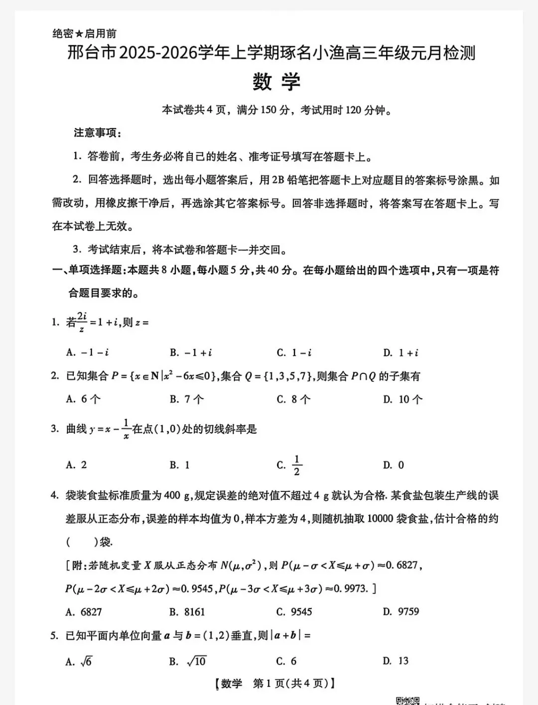「2026届河北省邢台市琢名小鱼高三上学期1月检测数学试题及答案.pdf」