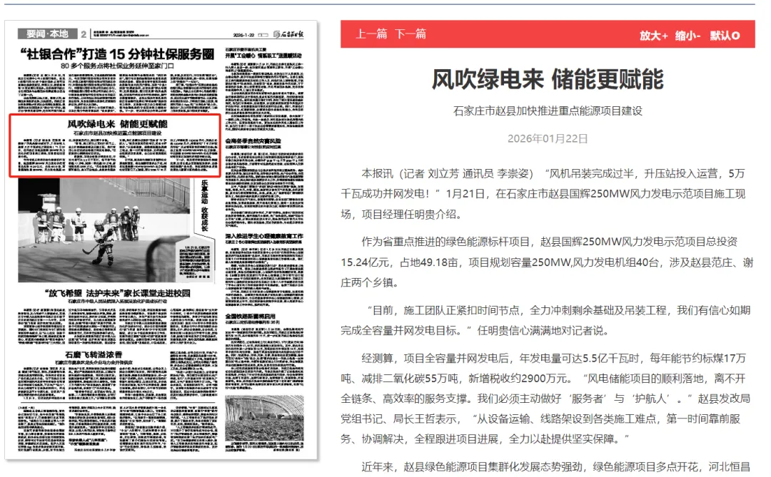 近年来,赵县绿色能源项目集群化发展态势强劲,绿色能源项目多点开花,河北恒昌能源100MW/200MWh独立储能电站项目已开工建设,预计2026年10月完工;华能赵县100MW风电、石家庄沁森100MW风电、省级首批“千乡万村驭风行动”试点等项目前期手续已办结;赵县工业园100MW/400MWh独立储能、中达储能200MW/800MWh电化学储能站等项目正加速推进前期手续办理。