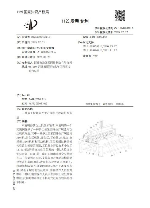 本发明涉及攻丝机技术领域,本发明的一个实施例提供了一种多工位紧固件生产制造用攻丝机及方法,其中一种多工位紧固件生产制造用攻丝机,其包括机架,还包括:工位架、夹持块、支撑架、攻丝机构和移动机构,工位架通过转动机构设置在机架的顶端,工位架上开设有多个加工口,夹持块滑动连接在工位架的一侧,夹持块上安装有第一电缸,第一电缸的输出端贯穿夹持块并与工位架固定连接,支撑架通过摆动机构转动设置在机架的顶端,攻丝机构设置在支撑架上,移动机构设置在机架的顶端,通过上述技术方案,降低了螺母的攻丝效率,并且操作人员在对螺母下料时,需要操作人员手部伸到工位处拿取螺栓,此种对螺母的上下料方式危险性较高的技术问题。(特别注意:任何单位或者个人未经专利权人许可,都不得实施其专利,即不得为生产经营目的制造、使用、许诺销售、销售、进口其专利产品,或者使用其专利方法以及使用、许诺销售、销售、进口依照该专利方法直接获得的产品。)