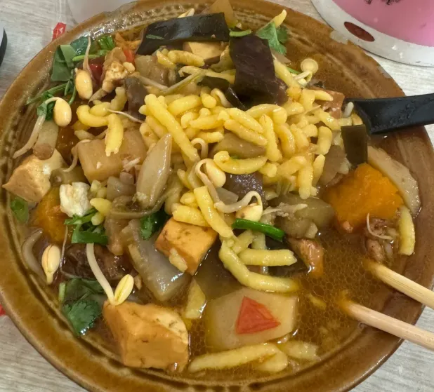 【抿须儿】这名字听着怪,吃着香。做法挺讲究:把豆面和白面按比例掺好,和成软面团。锅里水烧开,架上特制的“抿床”(带孔的铁板),手掌用力一推,面就像小蝌蚪一样落进锅里。煮熟捞出,浇上卤子,再淋点醋。汤一喝,人就醒了,那股子粮食的香气,是从喉咙暖到胃里的。