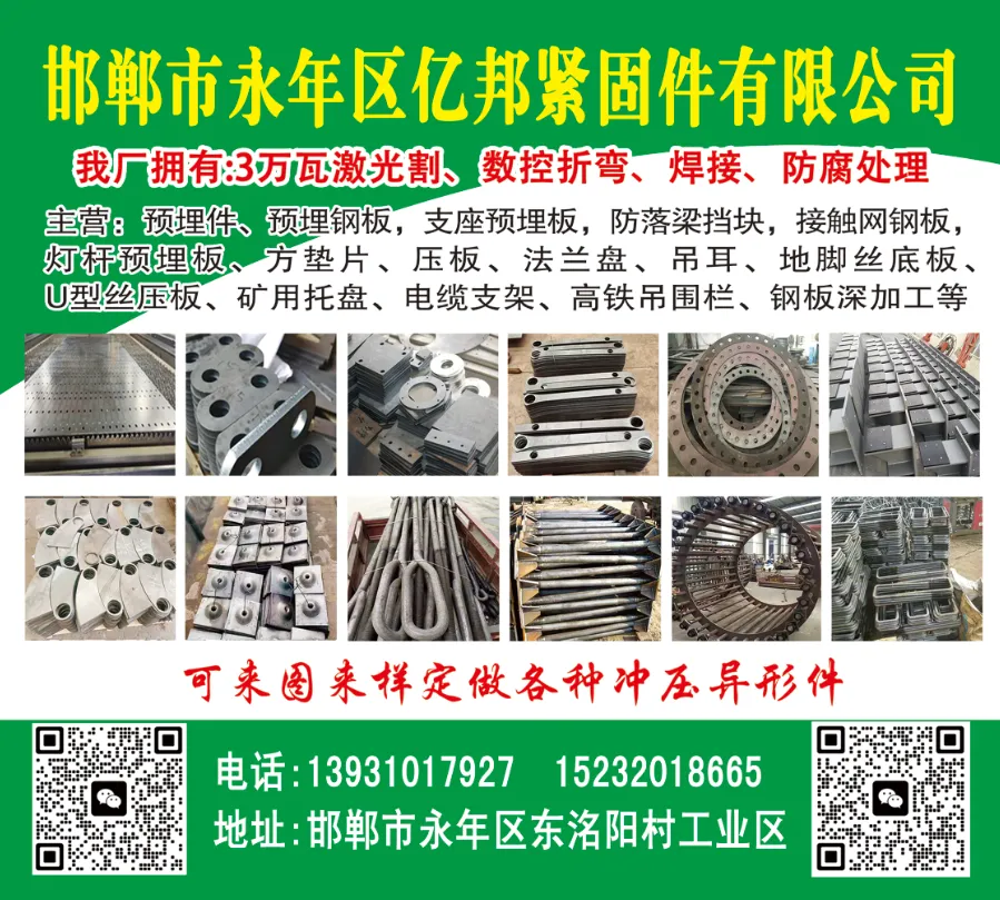 主营:预埋件、预埋钢板,支座预埋板,防落梁挡块,接触网钢板,灯杆预埋板、方垫片、压板、法兰盘、吊耳、地脚丝底板、U型丝压板、矿用托盘、电缆支架、高铁吊围栏、钢板深加工等