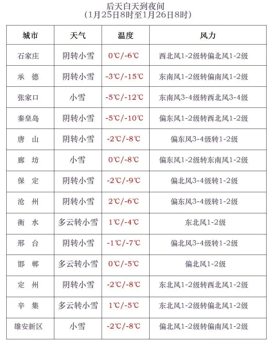 明天夜间到25日,张家口、承德、保定北部和西部、雄安新区、廊坊和石家庄、邢台、邯郸三个地区的西部山区多云转阴有小雪或零星小雪,其他地区晴转多云。