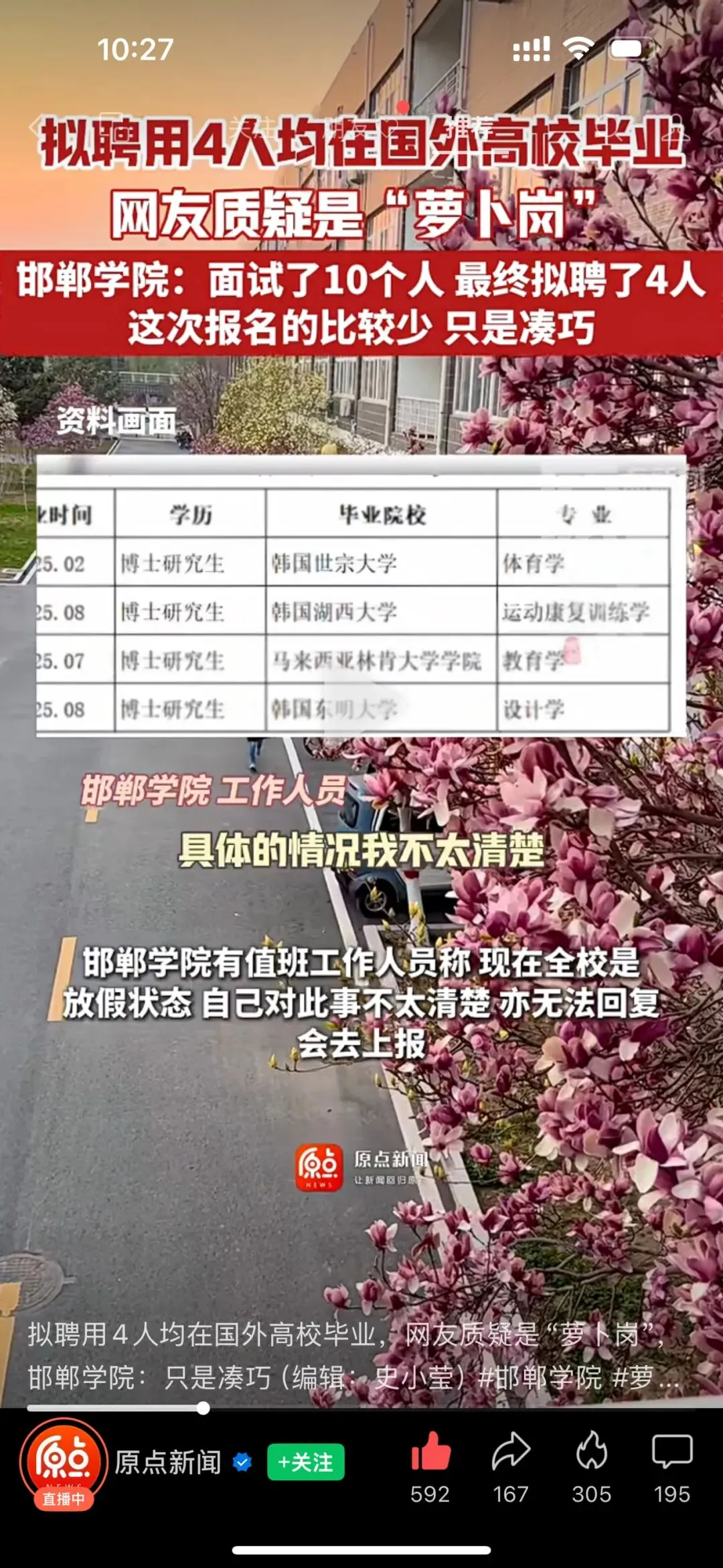 近日,河北邯郸学院因招聘了四名海归博士而上了热搜,大量网友质疑是“萝卜招聘”。