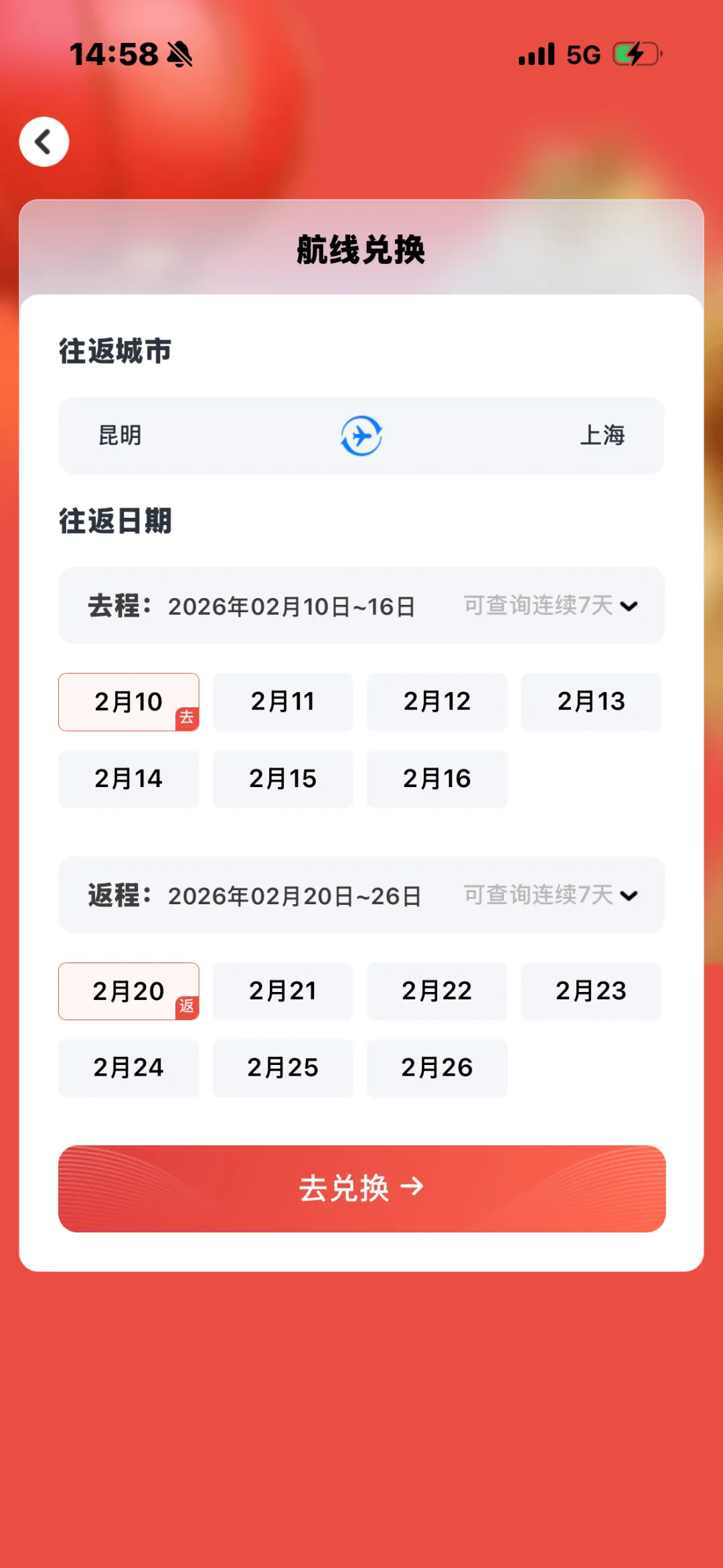 兑换时限须于2月18日(含)前一次性完成往返兑换