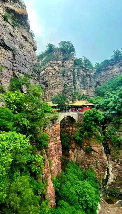 苍岩山石崖陡,桥楼殿搭在山谷之间,桥上有楼,楼中有殿,抬头能看天,低头见云影。