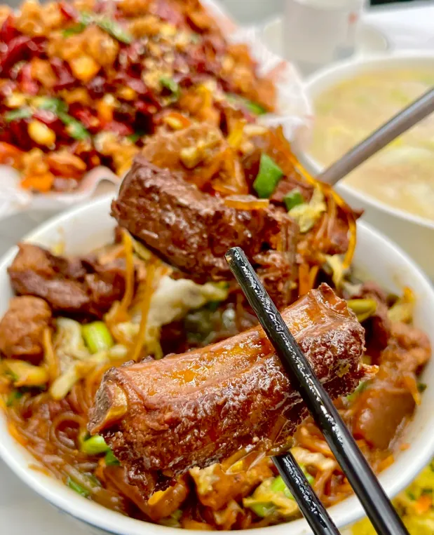 【林州大烩菜】这菜看着粗犷,其实讲究。得用大铁锅,底油要厚,先炒五花肉,把油逼出来,再下酥肉、豆腐、海带、粉条和白菜。不是煮,是“烩”,火候要足,让肉香钻进豆腐的孔洞里,粉条吸饱了汤汁,软而不烂。盛在海碗里,配个馒头,香得让人想家。