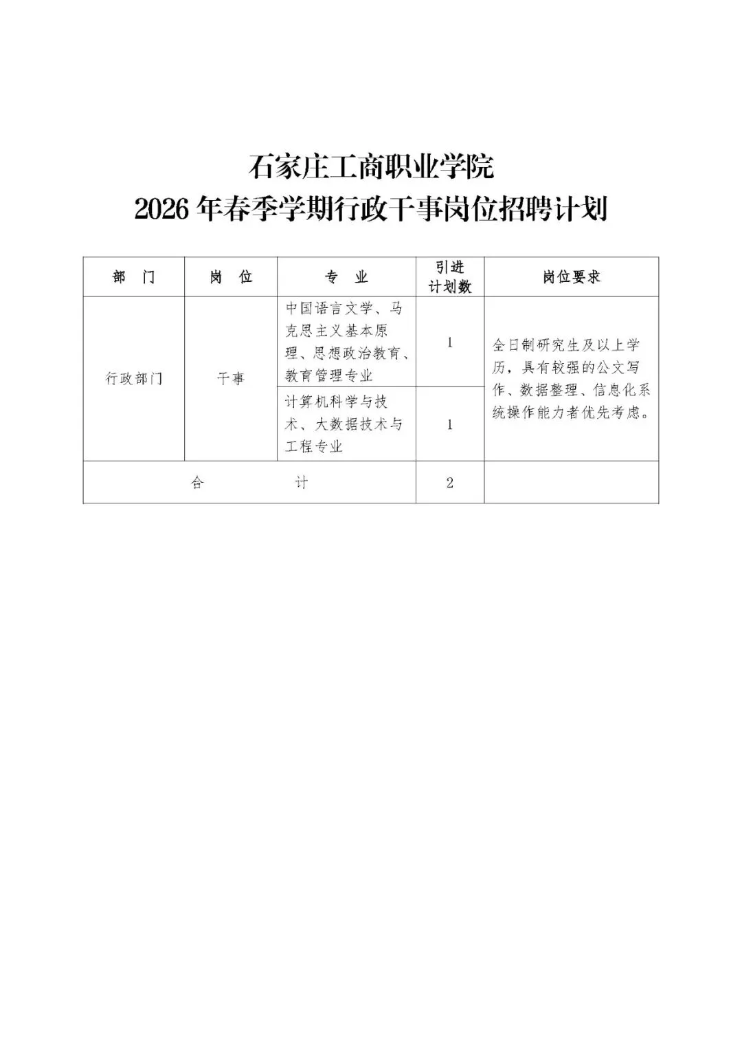 石家庄工商职业学院是河北省政府批准设立、教育部备案的一所全日制普通高等职业院校,其前身是1983年10月共青团河北省委创办的河北刊授学院。学院现有滨河、南山、望山三个校区,分别位于石家庄市桥西区滨河街3号、鹿泉区山前大道555号、鹿泉区望山路12号。下设数字财贸学院、智能工程学院、社会管理学院、智能制造学院、数字设计学院、智慧康养学院6个二级学院。先后荣获河北省直文明单位、省依法诚信办学学校、全国高职院校魅力校园、省学校安全工作先进集体等荣誉。根据学院事业发展的需要,为更好地选拔优秀人才,充实学院的师资队伍,优化人员结构,现决定面向社会招聘有关人员。现将有关事项公告如下: