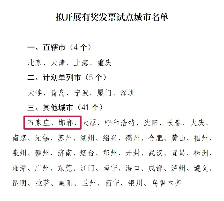 1月23日,商务部官网发布《拟开展有奖发票试点城市名单公示》。根据《财政部 商务部 税务总局关于开展有奖发票试点工作的通知》要求,商务部、财政部、税务总局于近期组织开展有奖发票试点城市评审工作。根据评审结果,拟确定50个城市开展有奖发票试点,河北省石家庄市、邯郸市入选。