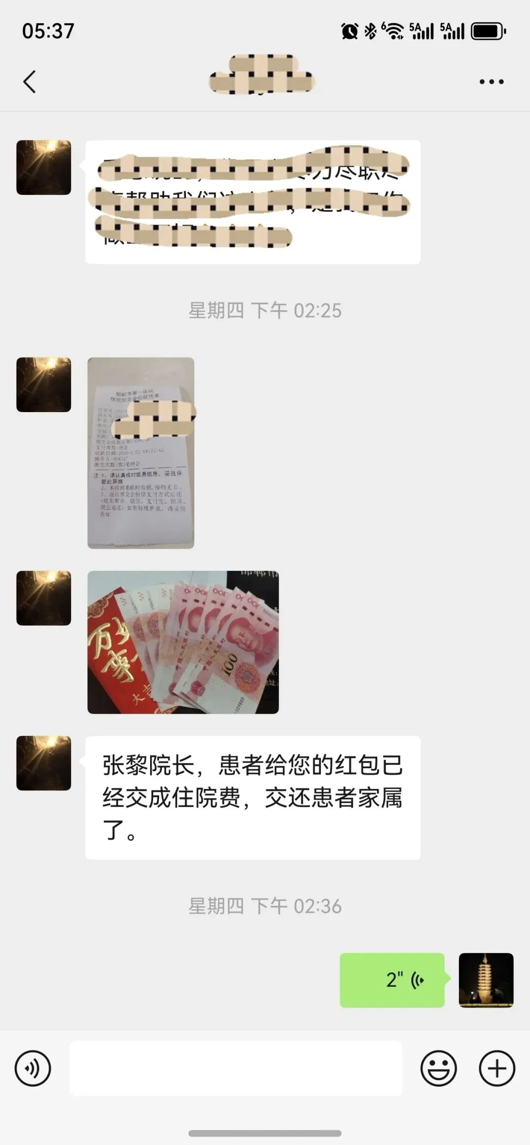 于是,张黎院长当即安排护士长,将这笔红包全额充入了患者的住院费用,并第一时间把缴费凭证交还给了家属。