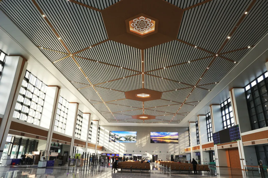 进入南站房,发现一层即为开阔的候车大厅。其内部延续了与北站房统一的设计:吊顶绘有绽放的月季图案,立柱线条则呼应井陉拉花中花伞的造型,巧妙融入石家庄地域文化元素。厅内同样配备电子售票机、安检系统、显示屏及综合服务中心等功能设施,为旅客提供便捷舒适的候车体验。