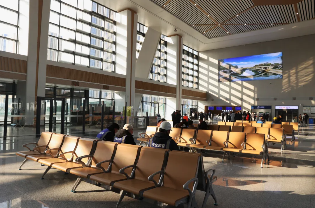 北站房二楼的候车大厅开阔通透,暖橘色的座椅整齐排布,干净而舒适。大厅上方的电子显示屏正实时更新途经列车的运行状态。通过检票口后,旅客便步入一座曲线造型的联通天桥。天桥两侧采用大面积玻璃窗设计,通透明亮,视野开阔,并分别通向2号至7号共六个站台。