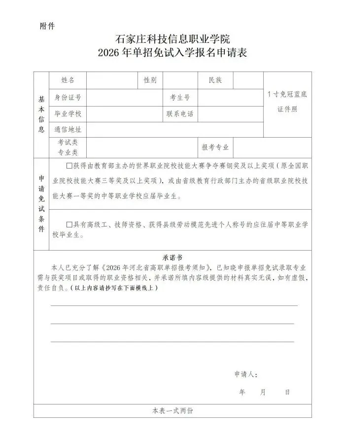 1、2026年2月3日9时至9日17时,通过河北省教育考试院官方网站(http://www.hebeea.edu.cn)登录河北省高职单招综合管理平台(https://gzdz.hebeea.edu.cn)(以下简称高职单招平台)进行网上报名并选择考试类、缴纳考试费。 2、请于2026年2月3日9时至9日17时前将免试入学申请所需材料电子版以电子邮件形式(邮件主题:姓名+专业+免试申请材料)发送至邮箱751857418@qq.com,纸质邮寄至石家庄科技信息职业学院招生就业处,未邮寄纸质版材料的考生视为自动放弃录取资格。三、免试入学申请所需资料: