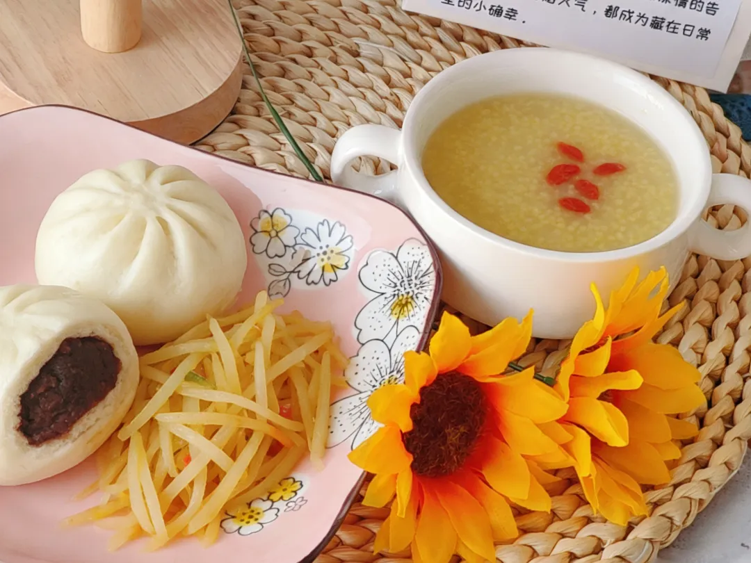 香甜豆沙包、清炒土豆丝、枸杞小米粥