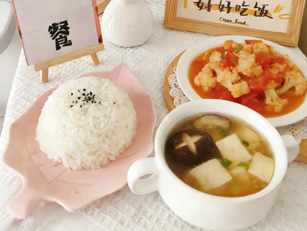 香米饭、五彩龙利鱼、番茄花椰菜、香菇豆腐汤