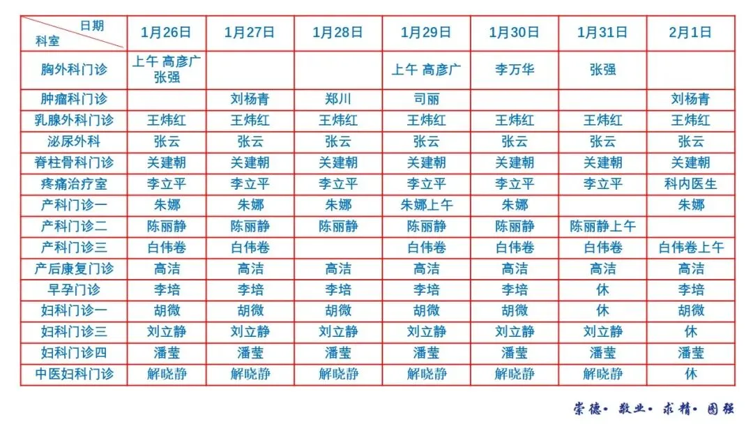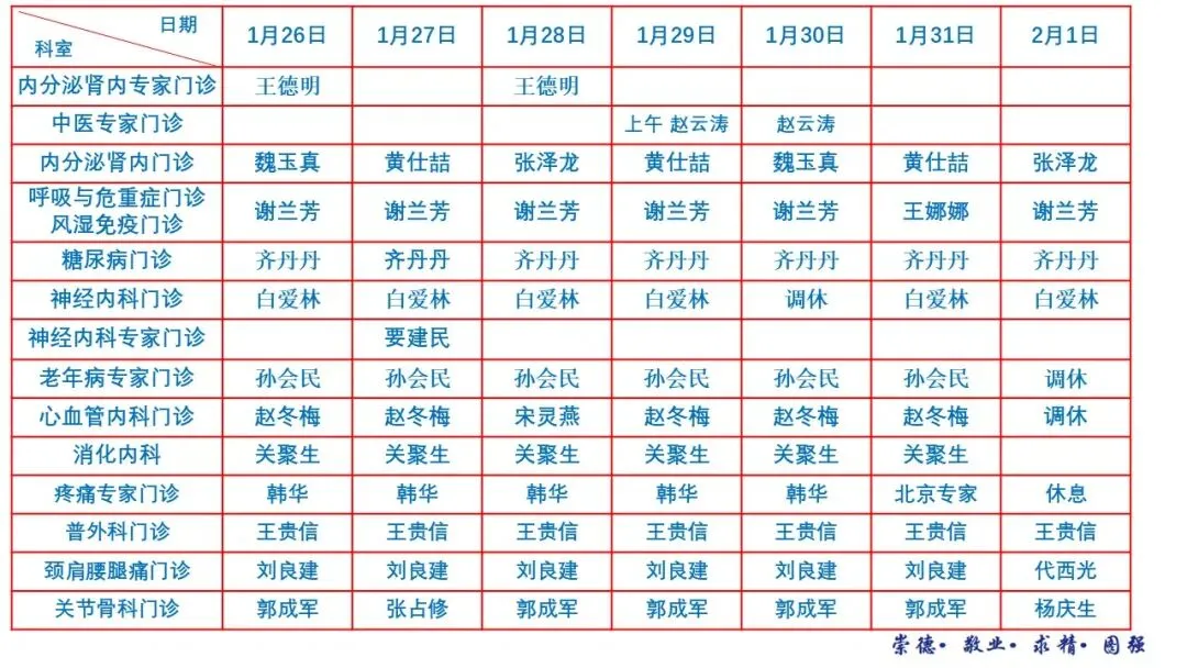 邢台市南和区人民医院1月26日—2月1日门诊医师出诊安排