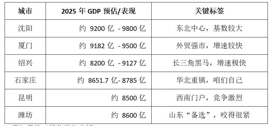 沈阳:作为老牌工业基地,底子很厚,2025年已经摸到了9800亿甚至更高的门槛,是这个班里最有可能先“升级”到万亿俱乐部的种子选手。