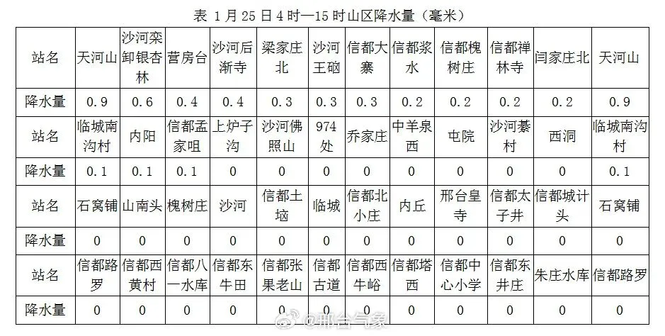 邢台市气象台1月25日15时发布天气实况和预报信息:【25日4时~15时】我市西部山区出现小雪或零星小雪,最大降水量出现在信都天河山0.9毫米。【预报】目前降雪结束,预计25日下午到夜间我市阴天,偏北风3~4级转2~3级,最低气温-10~-4℃。