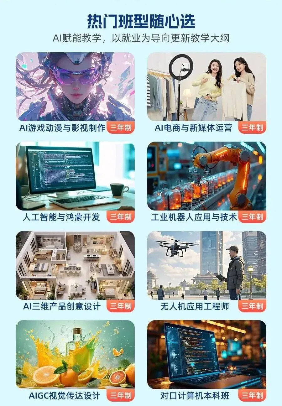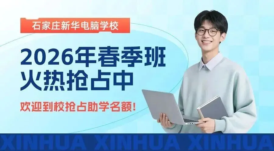 石家庄新华电脑学校2026春季招生热门专业:AI游戏动漫与影视制作、AI电商与新媒体运营、人工智能与鸿蒙开发、工业机器人应用与技术、AI三维产品创意设计、无人机应用工程师、AIGC视觉传达设计、对口计算机本科班。