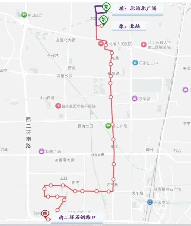 1. 起止点:始发站南二环石铜路口不变,终点站由北站南广场调整为北站北广场。