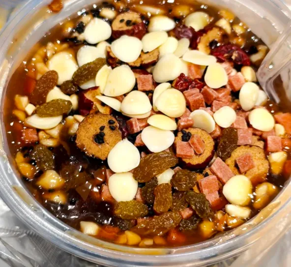 最值得一试的是杏仁茶。不是超市里那种冲泡粉,而是现磨的。选承德特产的苦杏仁和甜杏仁按比例混合,石磨细细研磨,滤去渣滓,熬煮时加一点米浆增稠。端上来如白玉般温润,勺子一搅,香气直往鼻子里钻,入口顺滑,微苦后甘,一碗下肚,燥气全消。