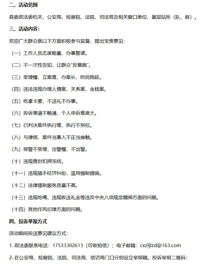 活动范围涵盖县委政法委机关,公安局、检察院、法院、司法局及相关窗口单位、基层站所(队、庭)。欢迎广大群众对工作人员态度粗暴、办事推诿,不一次性告知致群众反复跑,受理慢、立案难、办案拖延,违法违规办人情案等,以及吃拿卡要、投诉渠道不畅、案件执行难、与当事人不正当接触、违规查封扣押冻结