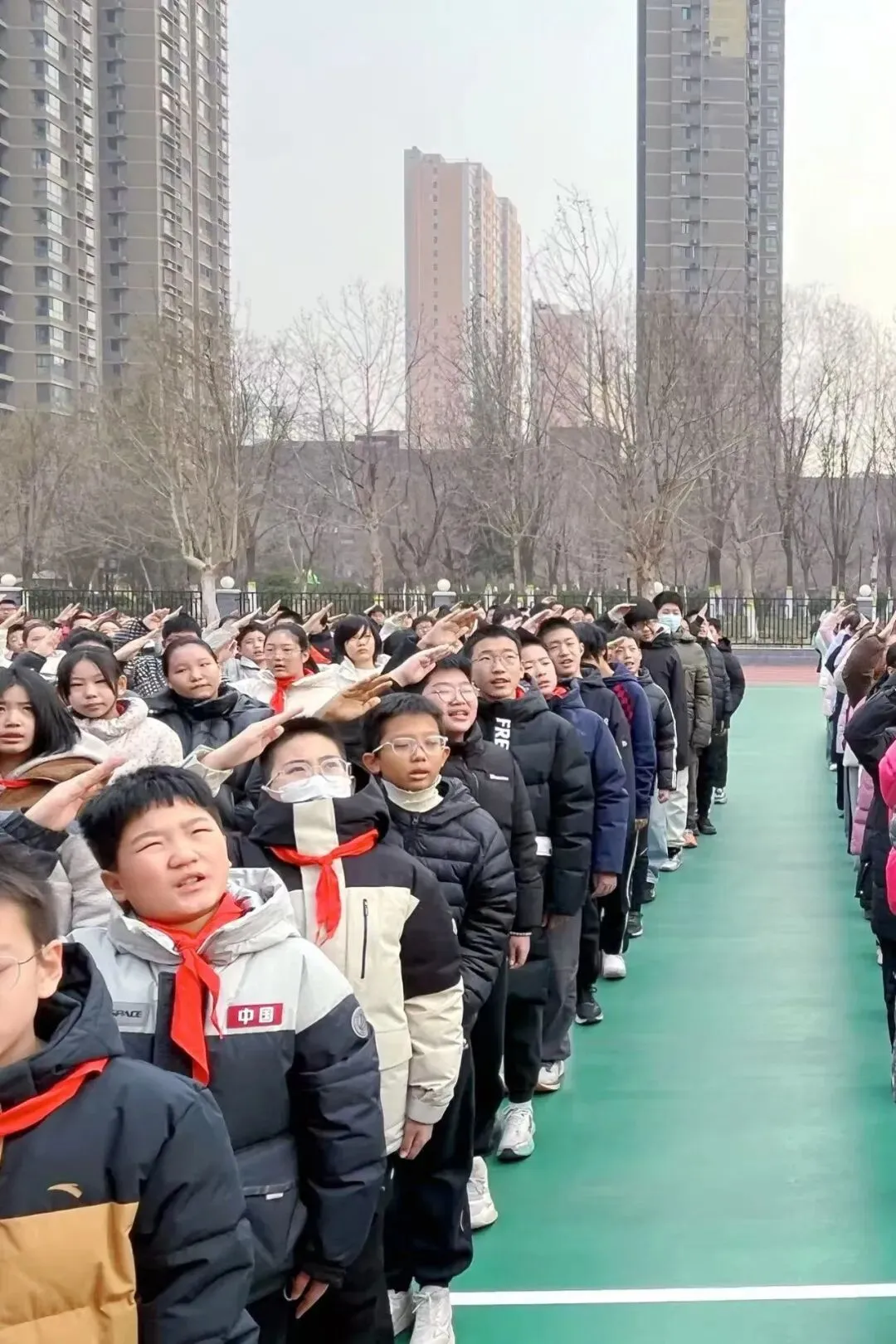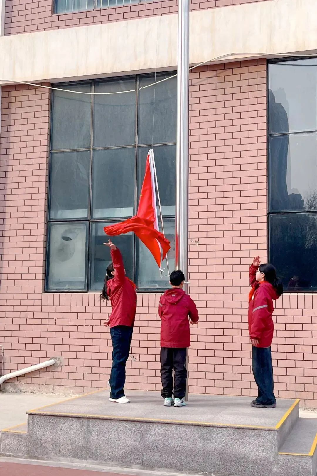 洪亮的口令响彻长空,升旗手振臂扬起国旗,鲜艳的五星红旗在嘹亮雄壮的《义勇军进行曲》中迎风绽放。全体师生在庄严的国歌声中,迎着阳光,目视五星红旗冉冉升起。迎风飘扬的五星红旗,燃起大家对新时代的无限向往。