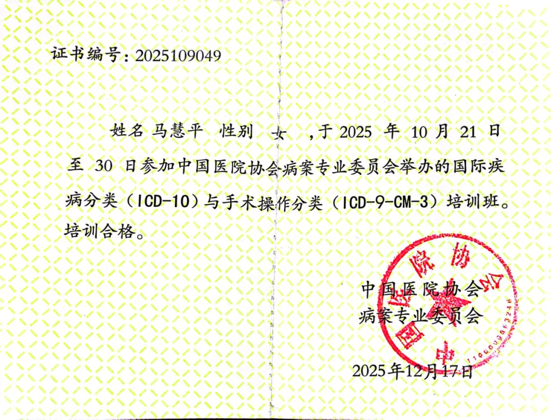 日前,从中国医院协会病案专业委员会举办的国际疾病分类与手术操作分类(ICD)应用能力培训班上传来喜讯,邯郸市中心医院病案科马慧平以高分通过考核,喜获证书。来自全国各家医院编码员165人参加,经过严格考核,仅有31人获证书,通过率18.8%。