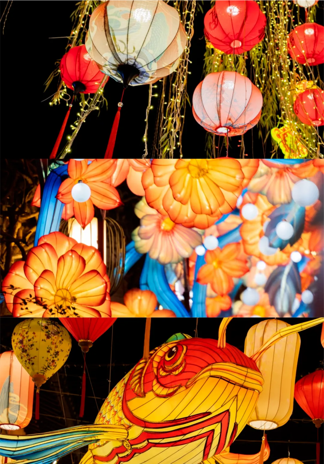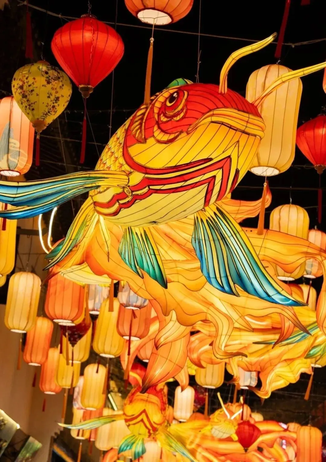 锦鲤鱼灯:万千锦鲤,悬游于空。那曳尾的光,是“鲤鱼跃龙门”最生动的注脚。行于其下,寓意自己来年步步生辉。