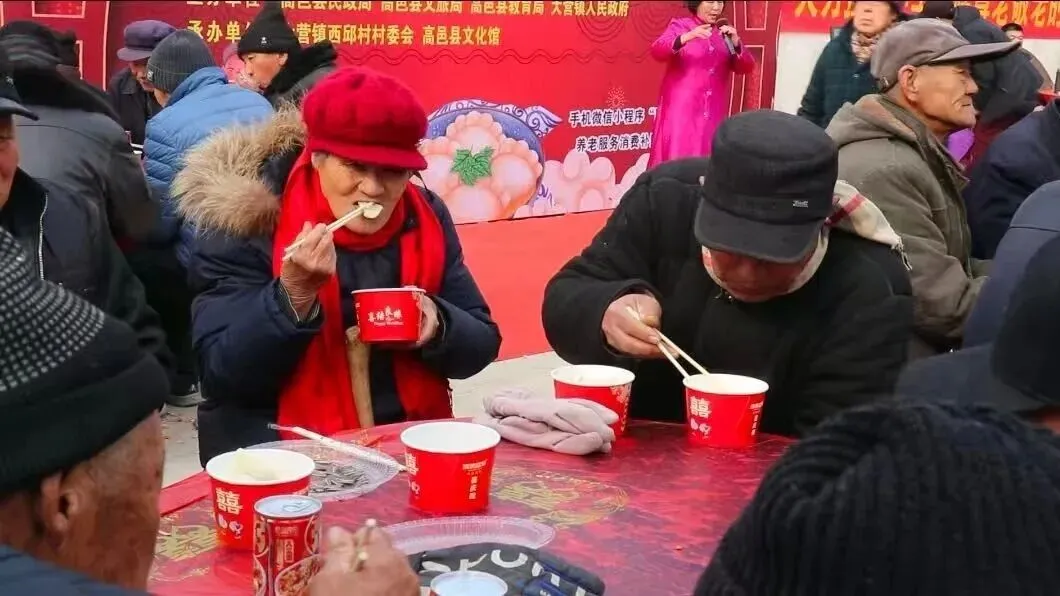 在西邱村新时代文明实践广场临时搭建的舞台上,戏曲演员们登场,经典的河北梆子选段字正腔圆、韵味十足;写春联的桌子前围满了人,书法爱好者挥毫泼墨;志愿者理发师细心为老人修剪头发;义诊台前,村医们正为老人测量血压、血糖,讲解冬季养生知识。热气腾腾的饺子出锅后,志愿者们端着托盘穿梭在人群中,将一碗碗饺子送到老人手中,还贴心地为每位老人送上寓意团圆的鸡蛋和温暖的军大衣。