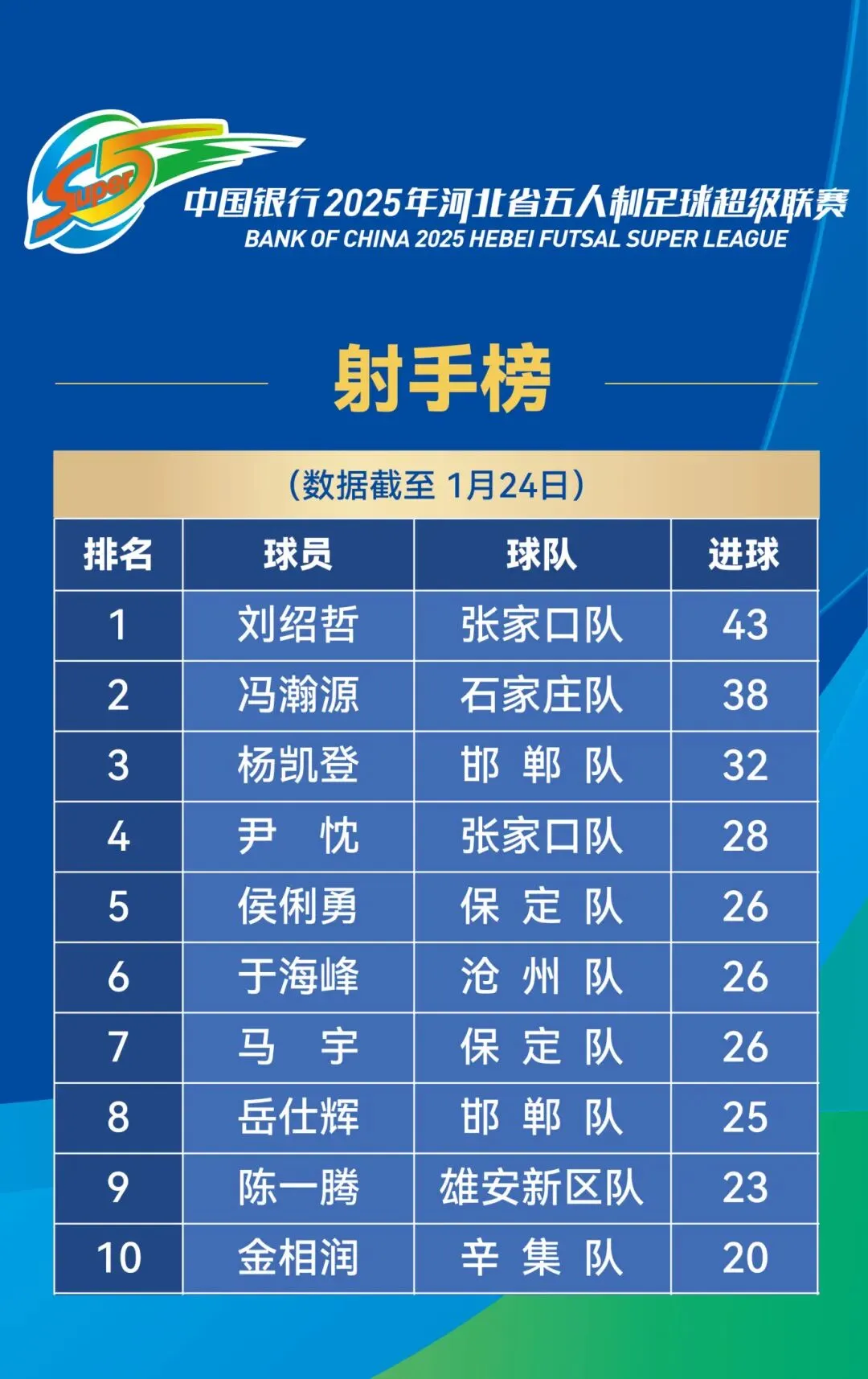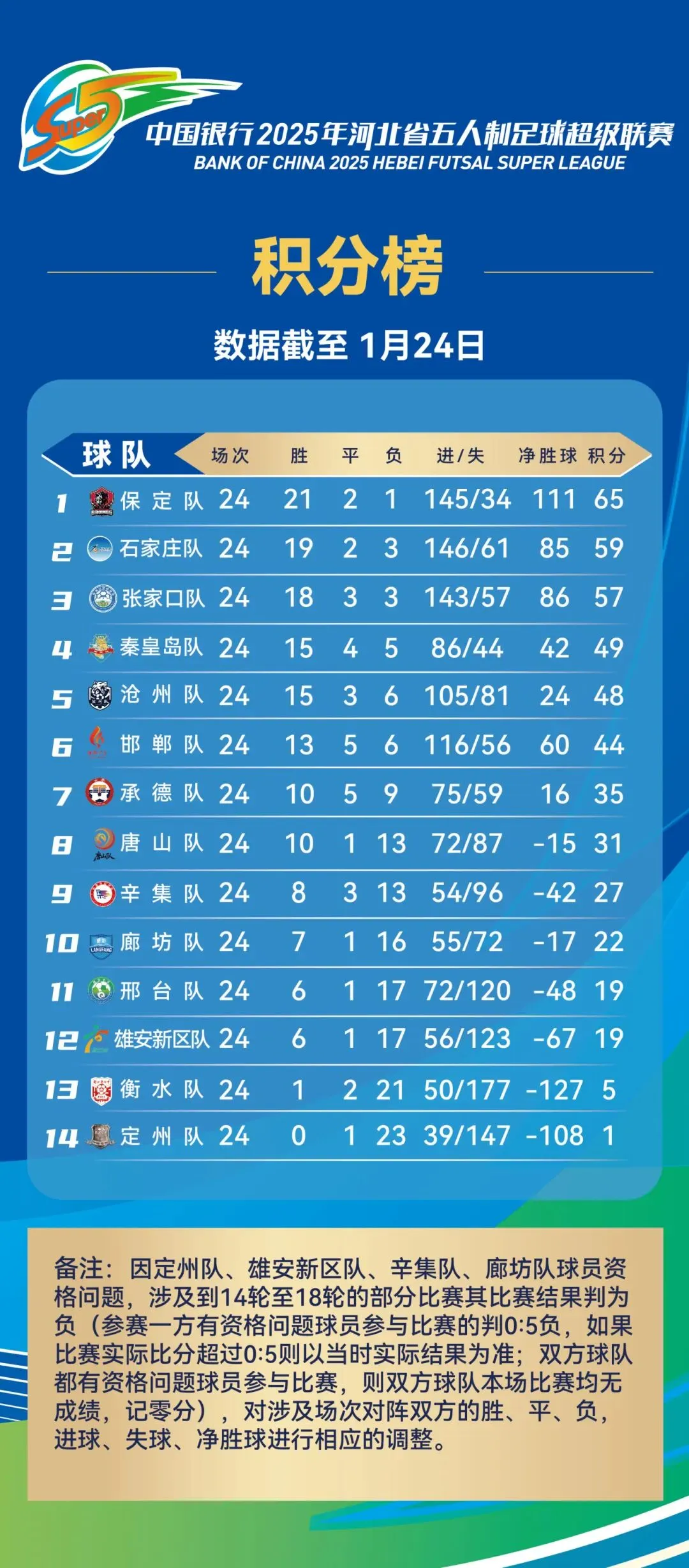 1月24日,“河北五超”第24轮比赛全部结束,积分榜再次迎来变化。最终,邯郸队主场3:6不敌石家庄队,联赛排名跌至第六位。联赛领头羊保定队继续强势表现,客场8:0战胜唐山队;而张家口队则主场“意外”败给承德队,联赛排名也被石家庄队超越。