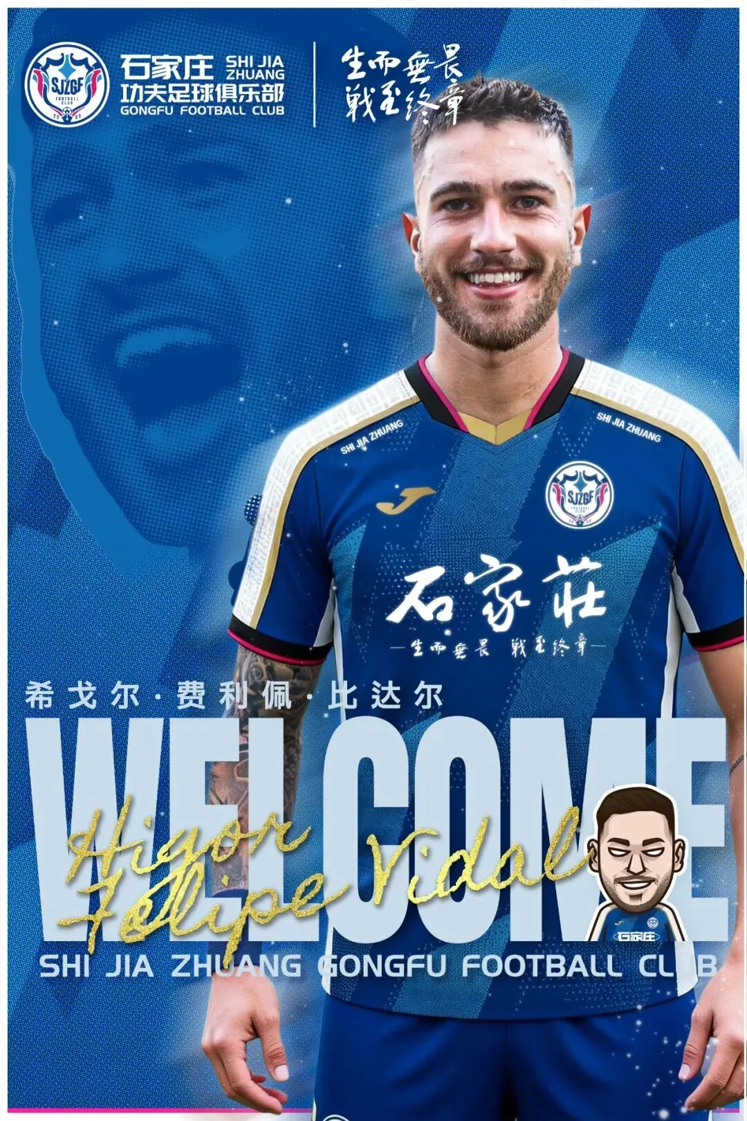 经与球员本人及图达都拉斯足球俱乐部友好协商并达成一致,即日起,巴西籍球员希戈尔·菲利佩·比达尔(Higor Felipe Vidal)正式加盟石家庄功夫足球俱乐部。
