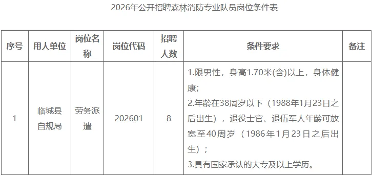 本次公开招聘森林消防专业队员8名,招聘人员为劳务派遣性质,由县自规局负责日常管理,具体招聘岗位详见《2026年公开招聘森林消防专业队员岗位条件表》。