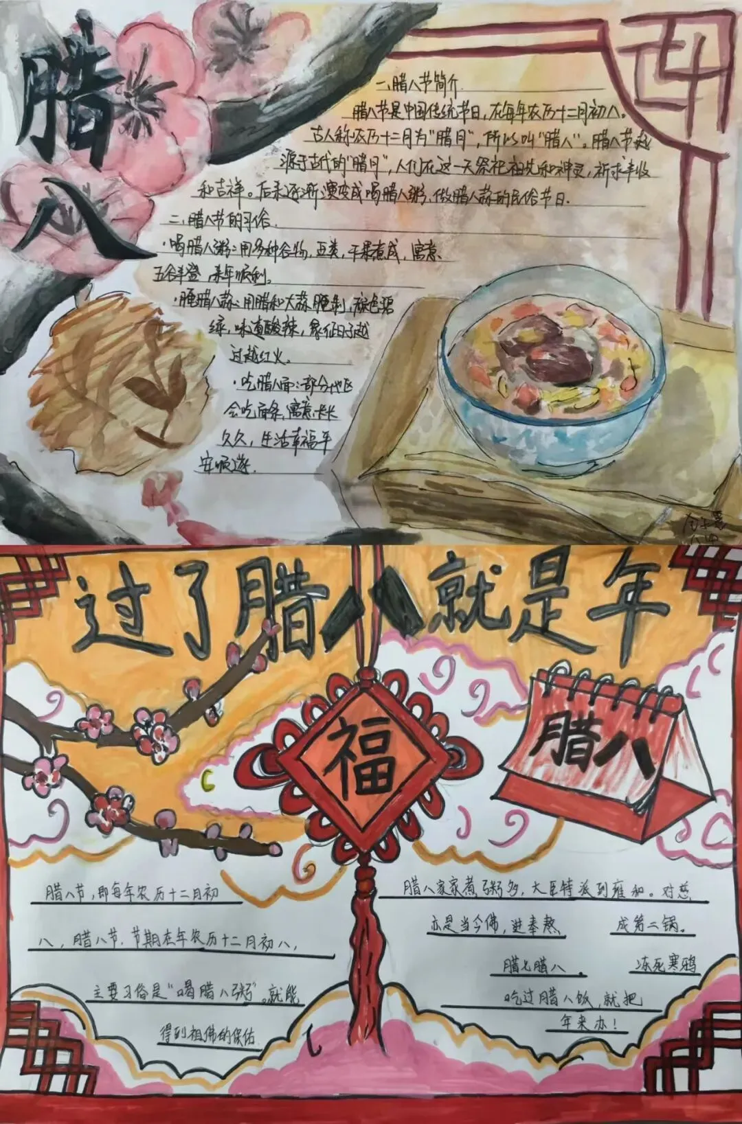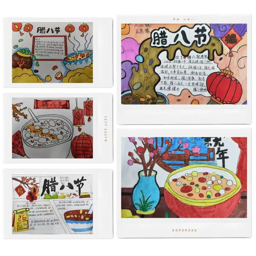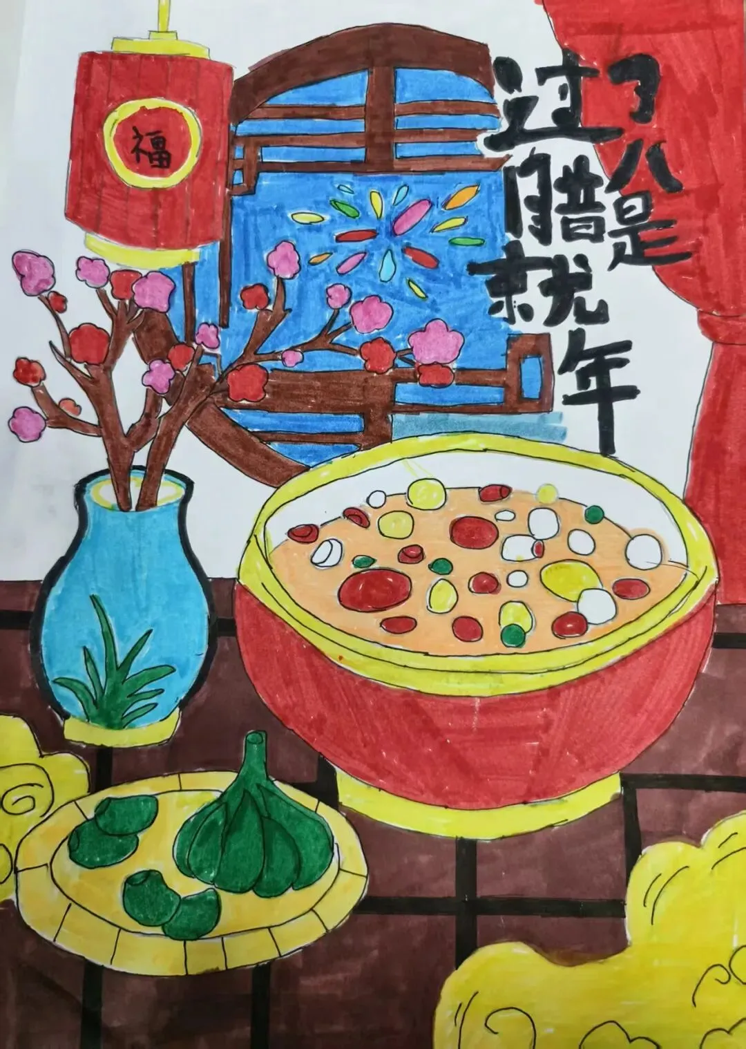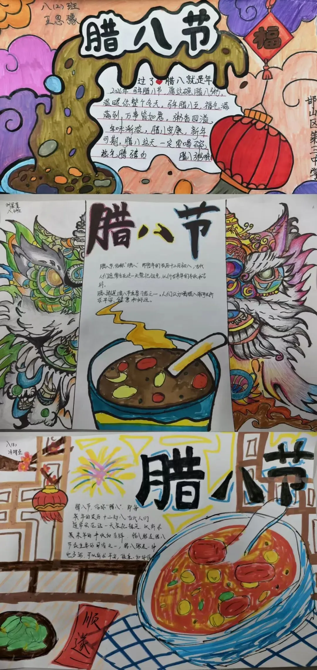 腊八节的智慧,在课堂上焕发生机。语文课堂上,老师带领同学们追溯“腊祭”的起源,从《荆楚岁时记》中“腊鼓鸣,春草生”的记载,到腊八粥“七宝五味”的食材寓意,一个个古老的故事让同学们读懂了节日背后“感恩天地、祈福丰年”的文化内核;美术课上,大家用彩笔勾勒腊八粥的缤纷食材、描绘腊八扫尘的民俗场景,一张张创意画作,成为传统节日的鲜活注脚;班会课上,一场“我的腊八记忆”分享会温情开启,有的同学讲述老家“腊八一过,年味渐浓”的习俗,有的同学分享与家人熬粥的温馨片段,言语间满是对传统的热爱与对家的思念。没有烟火气的煮粥场景,却让文化传承变得更具知识性与趣味性。