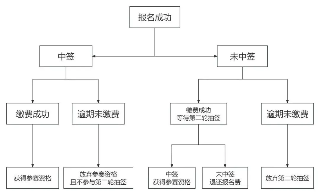 2、缴费时间截止后,中签选手如未缴纳报名费,产生剩余名额后,组委会将启动第二轮抽签,已中签未缴费选手将不参与第二轮抽签。
