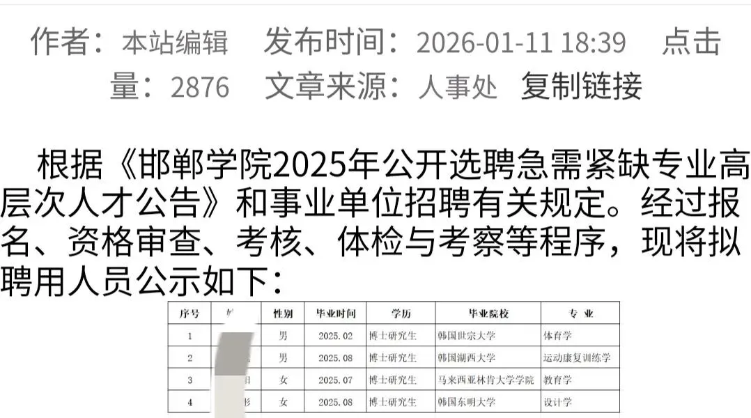邯郸学院2025年急缺人才引进名单:韩国博士共3人,马来西亚水博惹争议