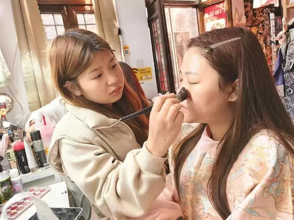 “那时候每天天不亮就去景区,冬天寒风刺骨,化妆师的手冻得握不住眉笔,却还是坚持给游客细致上妆。”在这份坚守下,店内的生意越来越好。