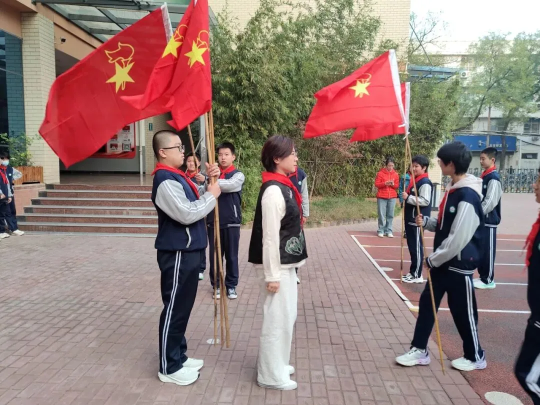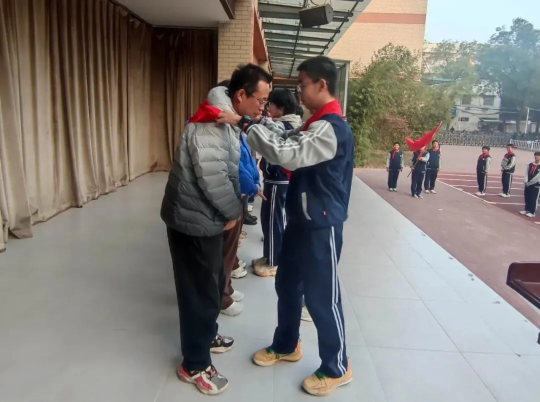 随后,少先队员为各中队辅导员佩戴红领巾。年级主任贾志红、常晨希老师为新成立的中队授予队旗。