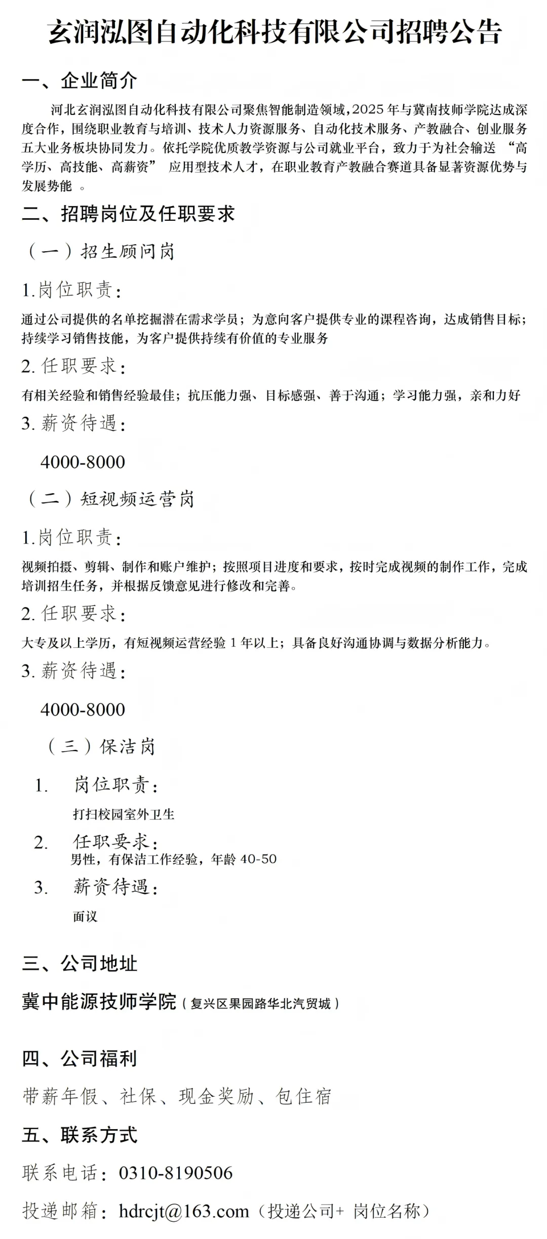 >邯郸市人才发展集团 · 招聘快报 |玄润泓图自动化科技有限公司招聘公告