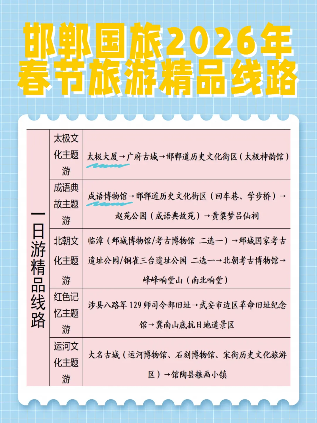 春临古赵,马年吉祥。作为中国成语之都,邯郸的每一寸土地都藏着千年文脉。2026 年春节,不必奔赴远方,邯郸及周边就藏着无数美景与惊喜。邯郸国旅深耕邯郸文旅多年,以 “专业、靠谱、贴心” 为初心,为你打造专属春节出行方案,涵盖5 条一日游、3 条两日游、3 条三日游主题线路,满足你与家人的多元出行需求。💡重点关注:邯郸太极大厦与邯郸成语博物馆在春节期间精彩亮相,携满满年味与深厚底蕴,向八方来客发出诚挚邀约,让每一位游客在新春佳节沉浸式感受邯郸“成语之都,太极之乡”的独特魅力。