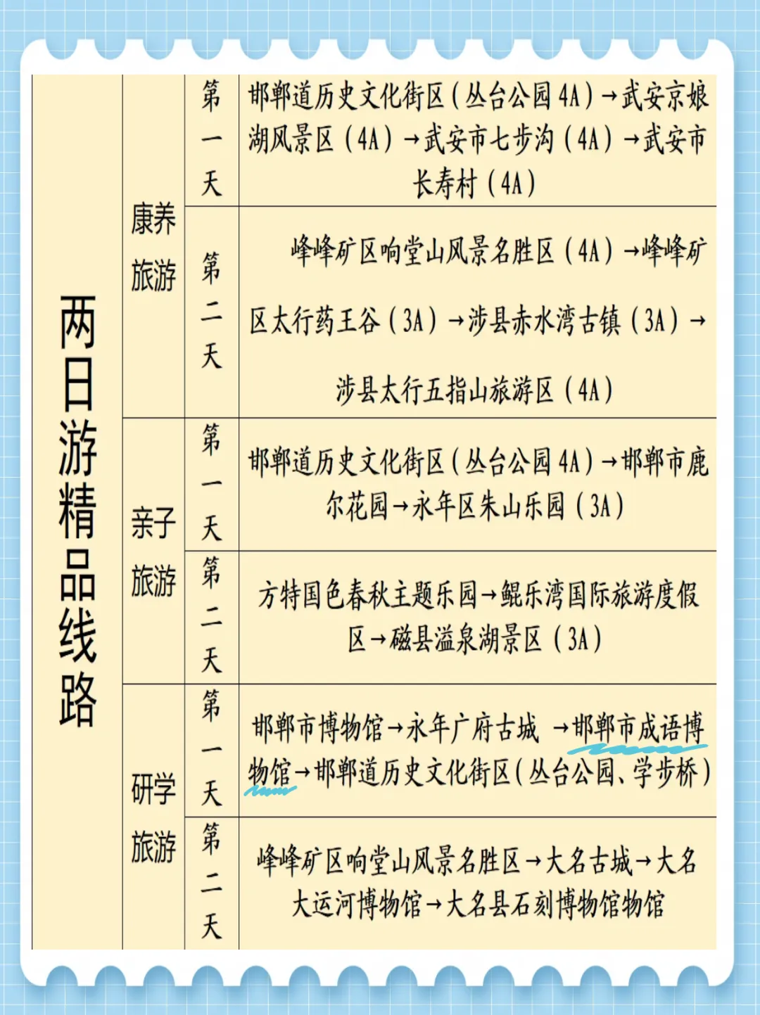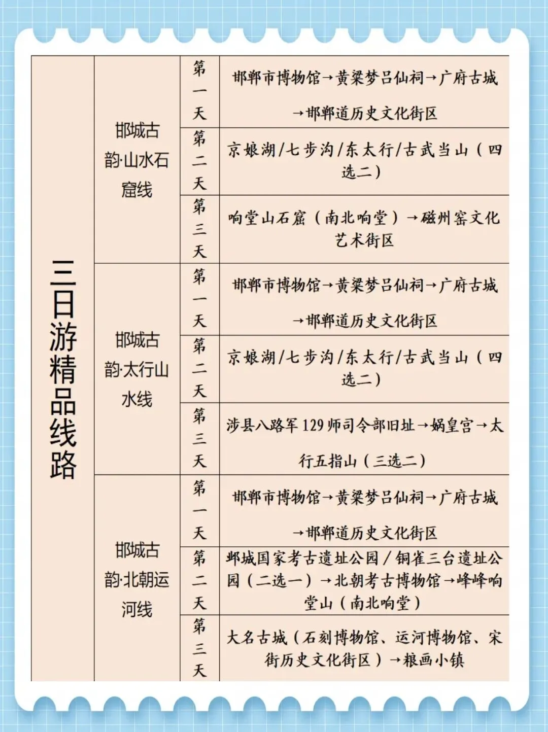 推荐理由:康养、亲子、研学主题全覆盖,节奏宽松不赶趟,适合全家沉浸式体验邯郸的多元魅力。推荐理由:串联成语之都核心文化地标、太行山水胜景与北朝运河遗迹,三天全景漫游邯郸,慢逛细品中读懂古赵千年底蕴。新的一年,愿你带着热爱出发,与山河相遇,与美好同行。