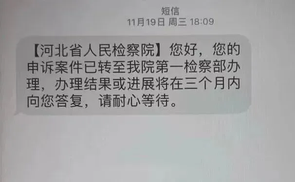 2025年11月21日收到12309短信:【河北省人民检察院】王曙光:您好!最高人民检察院转来您的信访材料收悉。经查,您反映的刑事申诉案件正在办理中,请耐心等待。