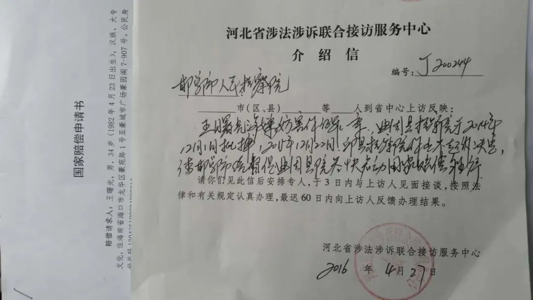 2016年4月1日,我与郑吉文律师向赔偿义务机关曲周县检察院提出国家赔偿申请。当面向曲周县检察院正式提交了国家赔偿申请书、律师手续、证据材料后,当时的经办人赵某平经请示检察长,赵某平告之不能出据手续,迟迟不受理。因曲周县检察院收到我及律师提交的国家赔偿申请材料后,迟迟不予出具材料回执和受理通知,致使我再次走上信访和申诉之路。
