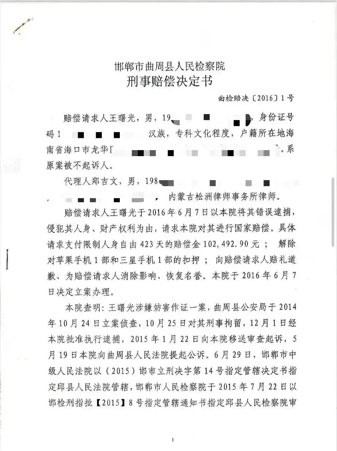 我不服曲周县检察院作出的不予赔偿决定,2016年8月16日,我委托代理律师郑吉文律师向邯郸市人民检察院提出刑事赔偿复议申请。2016年10月11日,邯郸市检察院认为:“赔偿请求人王曙光经曲周县人民检察院批准逮捕,被邱县人民检察院以事实不清、证据不足作出不起诉决定,根据《中华人民共和国国家赔偿法》第十七条、第二十一条第三款之规定,其有取得国家赔偿的权利,曲周县人民检察院应为赔偿义务机关,被羁押时间为424天。曲周县人民检察院以该案因曲周县公安局进行重新补充侦查,并提出了移送审查起诉意见为由,对赔偿请求人王曙光的赔偿请求不予赔偿的决定不符合法律相关规定。”邯郸市检察院作出邯市检赔复决[2016]3号刑事赔偿复议决定,依法支持王曙光的刑事赔偿请求,赔偿人身自由赔偿金102735.2元,精神损失抚慰金11700元,并为王曙光消除影响、恢复名誉、赔礼道歉。(见邯郸检察院刑事赔偿复议决定书)