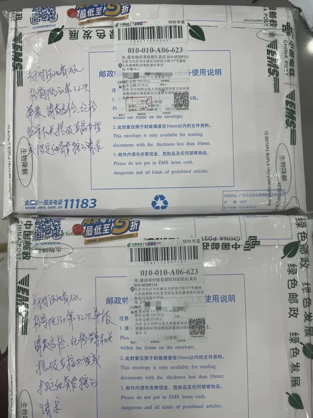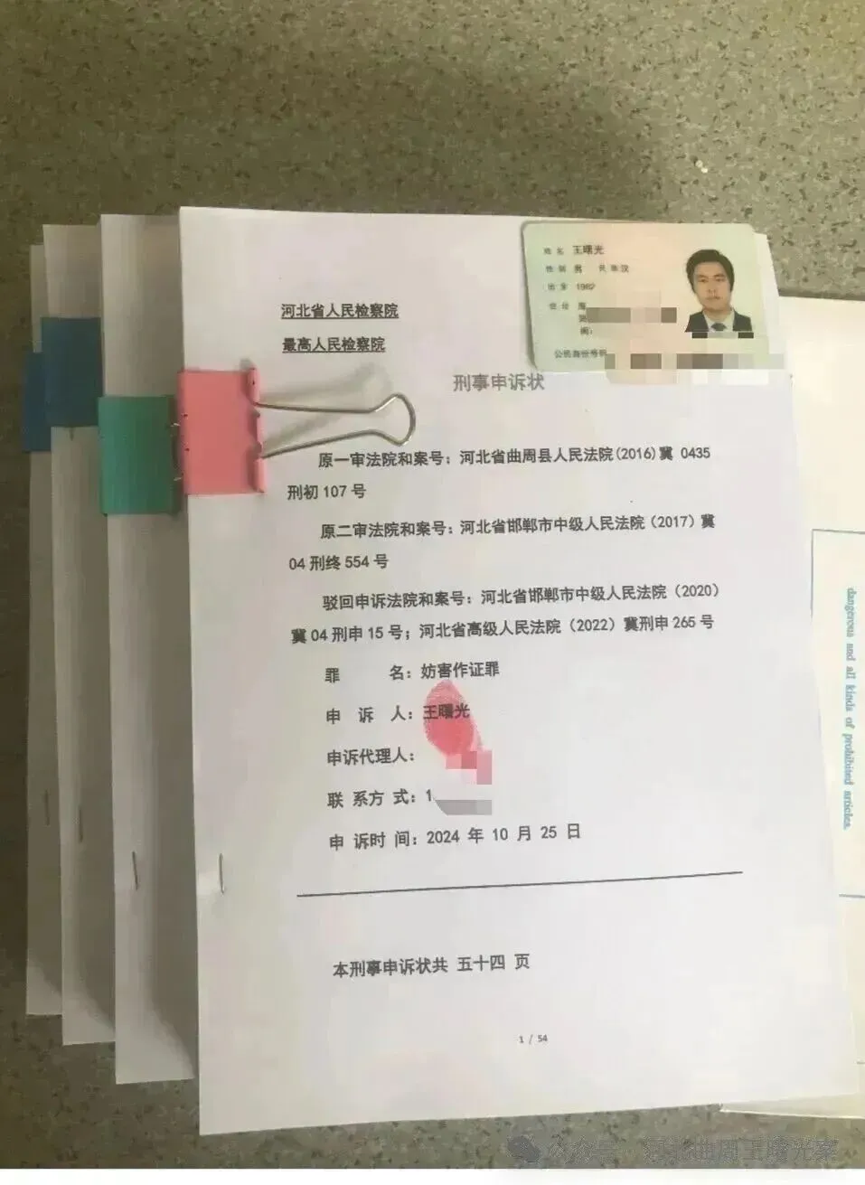 2025年10月7日、10月12日向最高人民检察院应勇检察长、最高检控告申诉检察厅陈鸷成厅长反映,提出刑事申诉至今仍未收到河北省人民检察院正式受案法律文书通知书。 2025年10月16日010-12309最高检回复说已转河北省人民检察院。