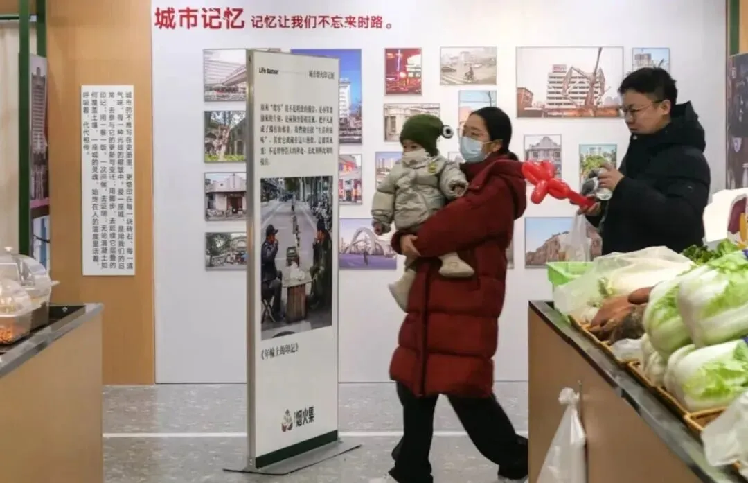 在怀旧氛围之外,致美·烟火集里面还融入了不少时尚元素。入口处的巨型蓝白条纹购物袋艺术装置上,“这世间所有美好都是我的菜”的标语格外醒目,蔬果区的顶部布置了许多彩色的充气蔬菜玩偶,让整个空间又增添了一丝活力。在此区域的旁侧,则是正在市集内举办的《城市烟火印记》摄影展,不少反映着石家庄几十年来城市发展变化的摄影作品在这里展出,顾客可以边买菜边欣赏记录城市变迁的艺术作品。“我们希望打造一个让市民愿意逛、愿意玩的菜市场,而不仅仅是完成采购任务的地方。目前,正在举办的摄影艺术展,以及未来计划的跨界活动,都在尝试探索菜市场的更多可能。”致美·烟火集市场企划负责人庞彦东对记者表示。